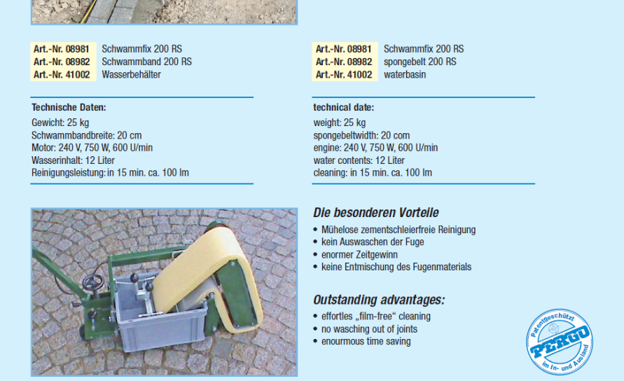 Maszyna do zmywania fugi z kostki brukowej, do prac wykończeniowych: obrzeża drogowe z kostki, opaski przydomowe. Duża łatwość obsługi i zaoszczędzenie czasu. Model PERGO 200RS został zaprojektowany jako idealne uzupełnienie ciężkiego sprzętu brukarskiego. Tam, gdzie duże maszyny nie są w stanie dotrzeć ze względu na swoje gabaryty, PERGO 200RS sprawdza się doskonale. Dzięki wąskiej konstrukcji roboczej urządzenie pozwala na precyzyjne czyszczenie nawierzchni tuż przy ścianach budynków, krawężnikach oraz na wąskich ścieżkach ogrodowych, eliminując konieczność mozolnego doczyszczania ręcznego na kolanach. Urządzenie działa w oparciu o system gąbkowy, który skutecznie zbiera nadmiar materiału fugującego pozostawiając kostkę czystą i estetyczną. Inwestycja w ten model to gwarancja przyspieszenia prac wykończeniowych oraz znacznego odciążenia pracowników.